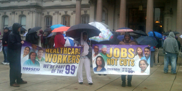 The actions in New York followed an earlier rally outside the New Jersey state house in Trenton, which had been sponsored by the Mid-Jersey MoveOn Council and several labor organizations. A dedicated group of 1199SEIU New Jersey members braved the cold and rainy weather to speak up for jobs and for the rights of working class families across the state. The demonstrators unfurled a large banner that read, “Jobs, Not Cuts,” to which cars honked their horns expressing their support. The rally at the New Jersey state house was organized to highlight the need for more jobs and to find solutions to the real challenges working families are facing across the state.