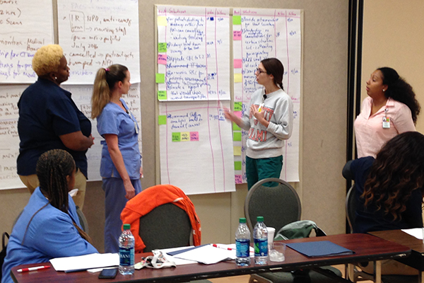 Nurses, transporters, management and other staff at University of Miami Hospital discuss potential solutions for more efficiently transporting patients.