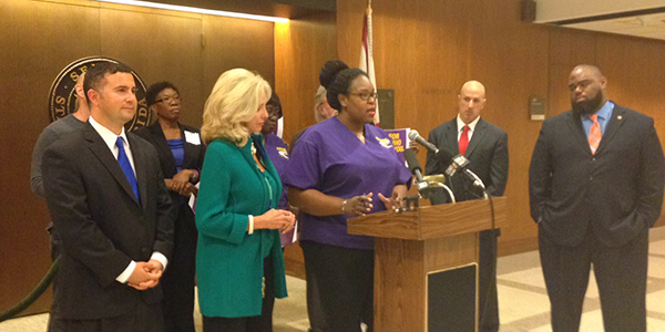 1199SEIU nurse leader Sheila Cherfrere joins State Senator Maria Sachs (D-Delray Beach) at a press conference to introduce legislation that would protect licensed caregivers and patients.