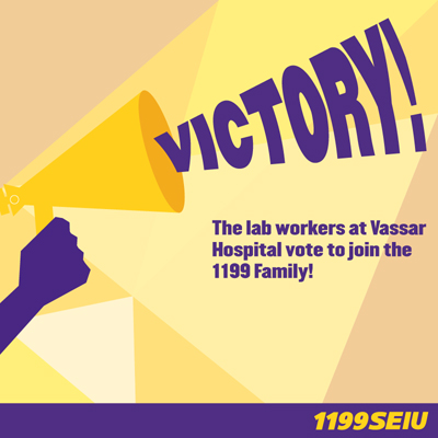 On July 27th, 48 lab workers at Health Quest voted to join with 1199. The lab, which is located inside Vassar Hospital in Poughkeepsie, NY, had been outsourced to Health Quest. Therefore, the workers were not included in the bargaining units originally organized at Vassar. With this victory, the lab workers join their colleagues at Vassar Hospital as 1199 members.