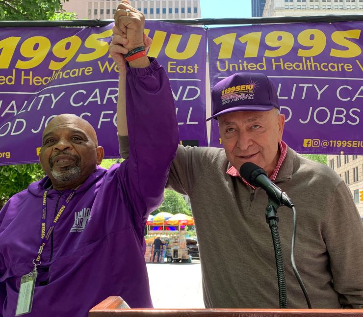 Hundreds of 1199SEIU homecare workers joined Senate Majority Leader Chuck Schumer at New York’s City Hall in lower Manhattan on May 4 to thank Senator Schumer, President Biden and their colleagues supporting the American Jobs Act. President Biden’s proposal includes $400 million over the next 10 years to help and reform the growing homecare industry. The pandemic highlighted the struggles of homecare workers who care for millions of seniors and disabled people. With explosive growth expected in the sector, homecare workers are calling for reforms to the industry that recognize their indispensable place in health care. Lilieth Clacken, a home health aide with the All Metro and Region Care agencies thanked Sen. Schumer for his unfailing support of homecare workers and urged him to fight for the passage of the American Jobs Act. “I am a mother and a grandmother.
