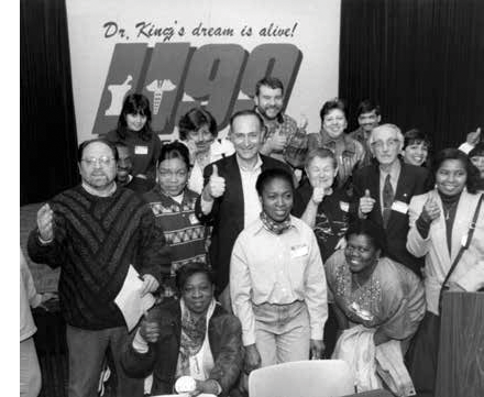 In the late 1980s, 1199 emerged as a major political force in New York City. The Rev. Jesse Jackson’s 1988 campaign for president on the Democratic Party line brought together progressives from across the city and state. The state campaign was headquartered at 1199 and led by then 1199 President Dennis Rivera. Thousands of 1199ers helped get out the vote, and Rev. Jackson carried the city.