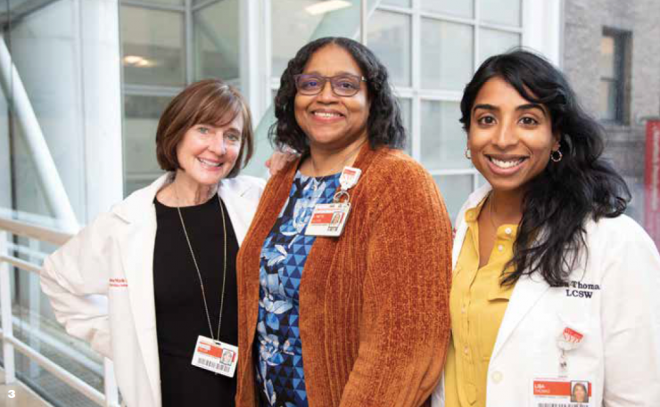3. “Being a social worker in a hospital is different from on the outside,” says Lynette Williams (middle) a Social Worker in Outpatient Oncology for 20 years. “We have to learn medical jargon so we can explain to patients what they will be facing when they get home.” Working with cancer patients poses specific challenges, adds Angela Heller (left), an Oncology Social Worker of 35 years standing.
