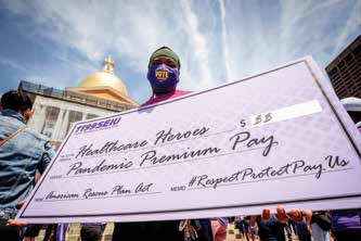 5. ARPA premium pay – Massachusetts After many months of campaigning by 1199ers in Massachusetts, the state’s healthcare provider, MassHealth, agreed to hazard pay for Personal Care Attendants (who do home care work) amounting to a 10% wage increase for the year beginning on July 1, 2021. The wage boost was paid for with federal money distributed under the American Rescue Plan Act.