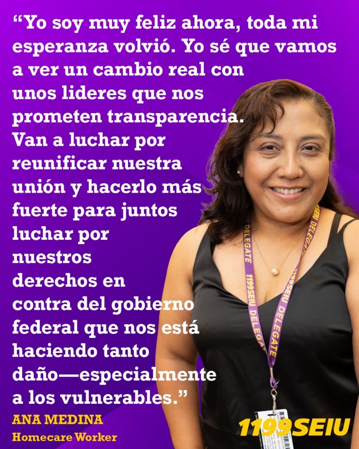 Estoy profundamente honrada de servir como su Presidenta, y estoy agradecida por el apoyo y la confianza que han depositado en mí. Ya sea que trabajen en un hospital, asilo de ancianos, cuidado de la salud en el hogar, clínica o farmacia, quiero que sepan esto: ustedes hicieron posible este momento. Y juntos construiremos un 1199SSEIU más fuerte y más unido.