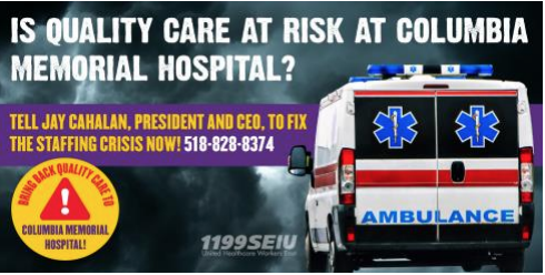 As the only hospital between Kingston and Albany, Columbia Memorial Health staff serves more than 100,000 residents in a healthcare desert spanning Columbia, Greene, and Dutchess Counties. The entire community is feeling the impact of hospital leaders who are driving workers from the bedside by providing inadequate wages and failing to implement appropriate recruitment/retention policies and practices.