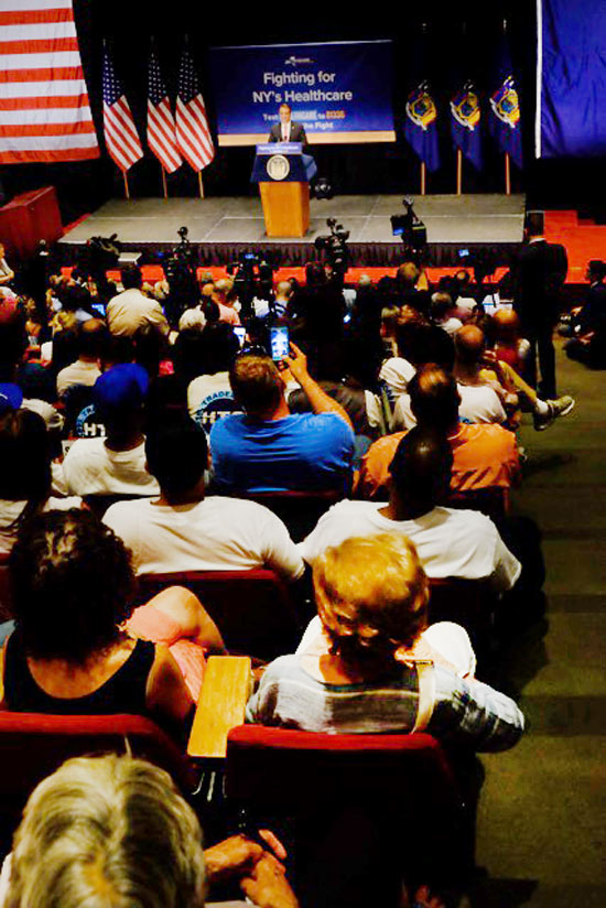 New York City Mayor Bill de Blasio visited the 1199SEIU call center on July 19th to demonstrate his appreciation for the hundreds of members who have been ‘burning up the phones’ to make sure US Senators vote ‘No’ on any bill to repeal and replace Obamacare. Earlier in the same week, NY State Governor, Andrew Cuomo led a ‘Save our Healhcare’ rally at Mount Sinai hospital in Manhattan attended by hundreds of healthcare workers and their political allies.