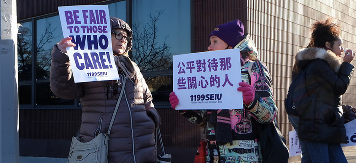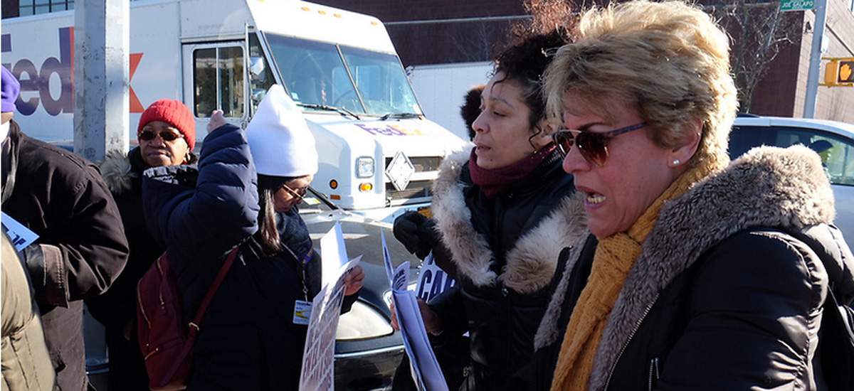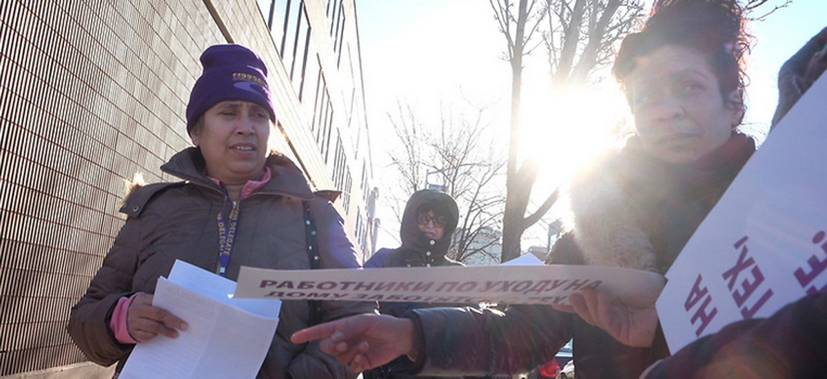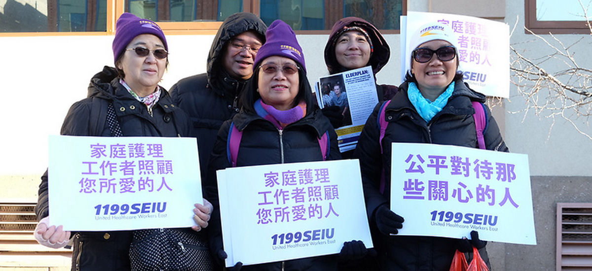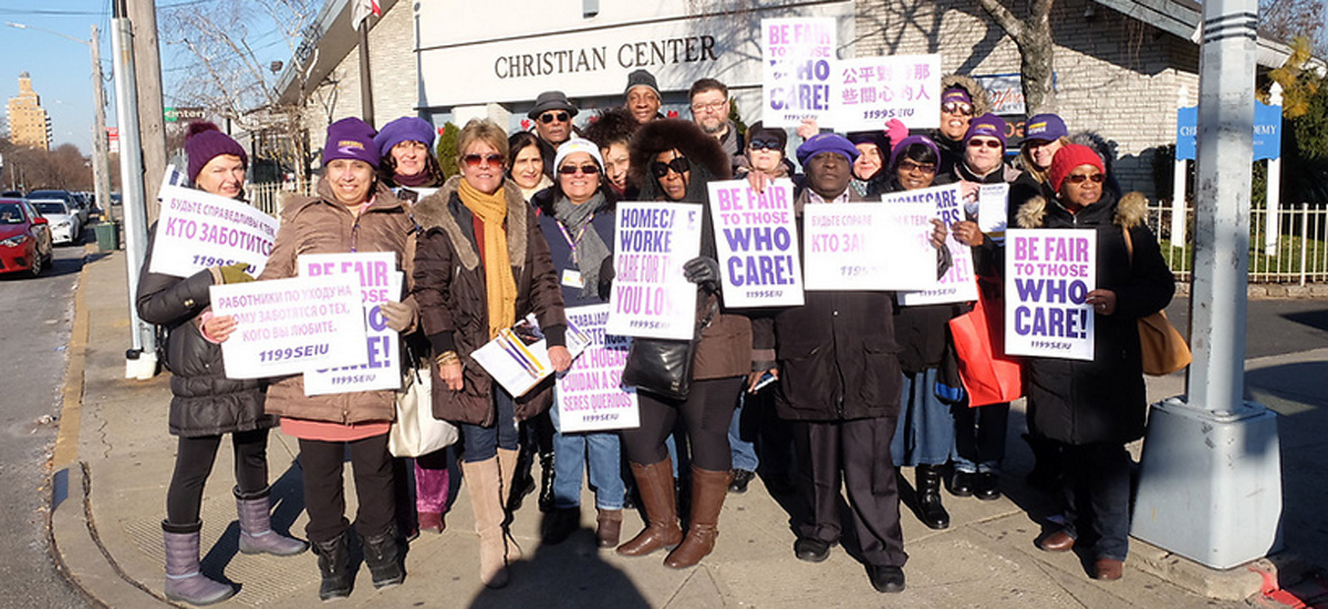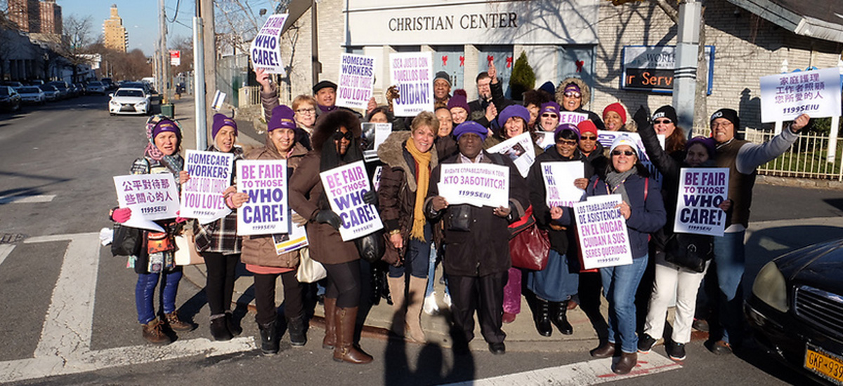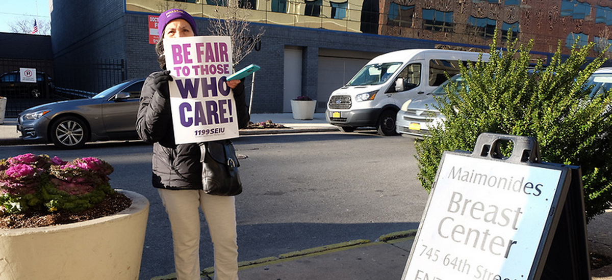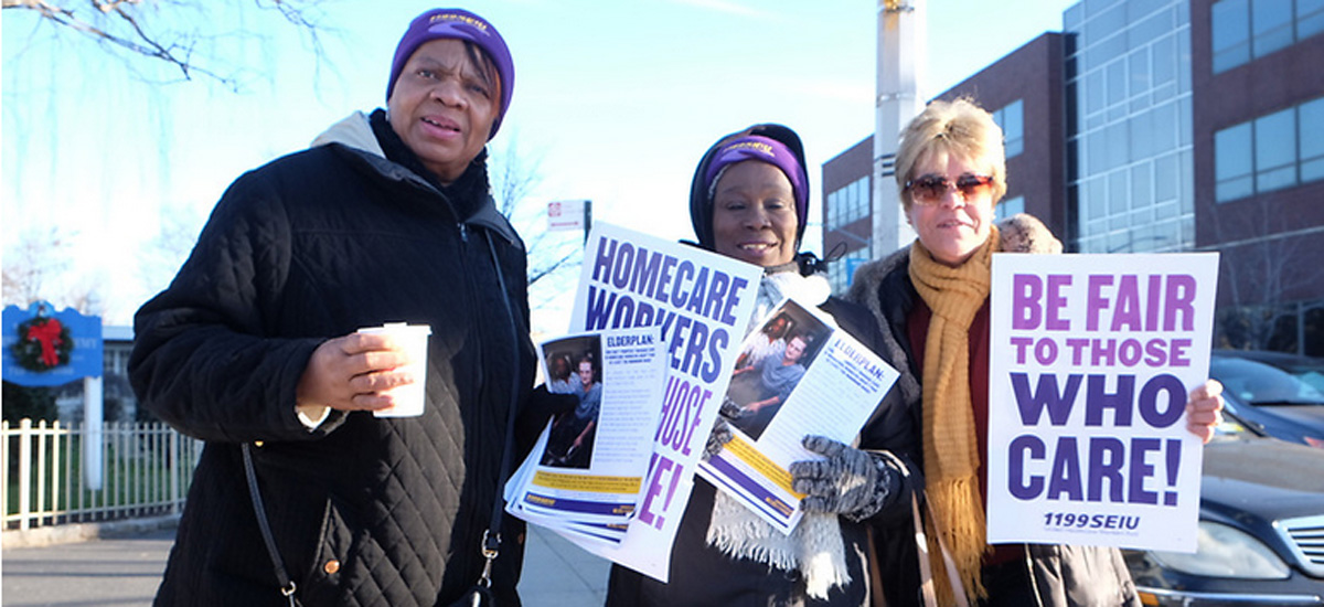 1199SEIU home care workers were out in force Thursday morning in front of Elderplan in Brooklyn demanding: Be Fair to Those Who Care!