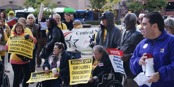The marchers gave messages along the way by chanting, “The people united will never be defeated,” and “They say cut back, we say take back.” It was a diverse crowd of people including senior citizens, disabled activists, and labor. At the Federal Building, a rally was led by Jerry Lotierzo of The Alliance for Retired Americans.