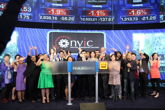 Members of the New York Immigration Coalition (NYIC), a social justice organization which has been on the front lines in the fight for passage of the DREAM Act and immigration reform, rang the closing bell of the NASDAQ, or the American Stock Exchange, on June 25 as part of the Coalition’s 25th anniversary celebration. The event was shared by thousands as it was displayed on the giant NASDAQ Tower in Times Square. 1199SEIU is among the NYIC’s major organizational supporters and a number of 1199ers attended the event.