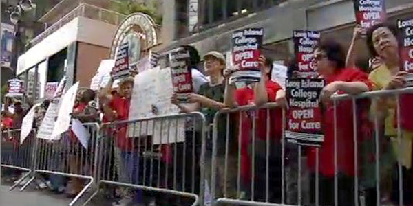 Scores of workers from Brooklyn’s Interfaith Medical Center and Long Island College Hospital rallied outside Governor Andrew Cuomo’s Manhattan office July 8, calling on him to intervene in the current funding crises at their institutions and to stem the tide of hospital closures throughout the borough of Brooklyn.