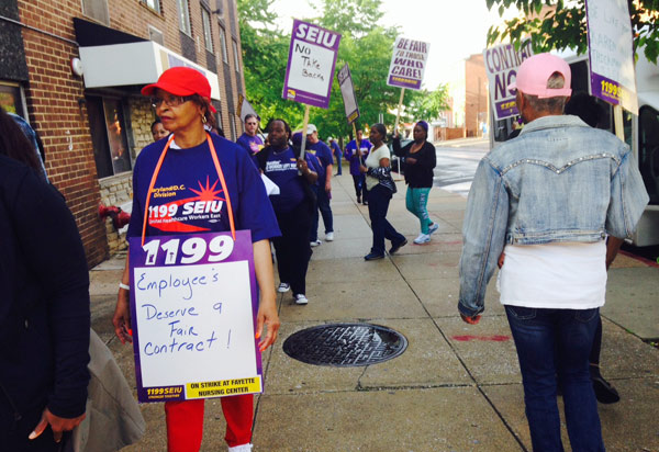 January 1, 1970Caregivers at Fayette Health and Rehabilitation Center held a 24 hour strike that began at 7am on Thursday, May 22. The 50 service, maintenance and technical employees at Fayette who belong to 1199SEIU United Healthcare Workers East are fighting to end poverty pay at the nursing home.The action came more than a year into tense negotiations for a new union contract at the nursing home. Currently, pay at Fayette is so low that many workers hold multiple jobs and quality for public assistance. Over 80 percent of Fayette caregivers make less than $14.92 an hour, the wage that qualifies a single parent and child for food stamps. A quarter of Fayette workers make less than the poverty level for a family of four, which is $11.47 an hour.Laundry worker Rashida Teombe has been employed at Fayette for 11 years, and currently makes $9.86 an hour—only 86 cents more than the starting wage for the position. “We just want management to treat us the way they would want to be treated,” she says.The nursing home’s Ohio-based owner, CommuniCare, is proposing wage caps for all union positions, and employees who are at or above the cap will no longer receive across-the-board raises. In addition, workers’ service would not be rewarded with guaranteed raises; wage increases would only be granted based on the facility’s profit margin. Another hotly contested issue is management’s threat to end the Training and Upgrading Fund.Fayette workers made the decision to move forward with the strike after the nursing home submitted its “last, best and final” offer in November, 2013, which fell short of the union’s proposal for a 3.25 percent wage increase during each year of the contract.Among the difficulties that the facility’s workers face is chronic understaffing. Six of CommuniCare’s eight Maryland facilities—including Fayette—are ranked in the bottom 50 out of 223 Maryland nursing facilities for having the lowest total staffing hours per resident per day.“Fayette caregivers work in challenging conditions every day,” says union organizer Taren Peterson. “Workers deserve to be compensated fairly for the quality services they provide. Many Fayette workers are on public assistance and already paying up to $200 a month for health care. Management needs to understand that part of providing quality care to patients means paying workers a living wage.”The strike came at the heels of a three-day strike at Johns Hopkins Hospital this April, during which hundreds of 1199SEIU workers demonstrated against the hospital’s low wages with mass community support.Unless a contract is settled, the next bargaining date is set for June 26, which will proceed with a mediator.- See more at: http://www.1199seiu.org/maryland_caregivers_strike_to_demand_contract_and_protest_poverty_pay_at_nursing_home#sthash.Ro6k4a49.dpuf