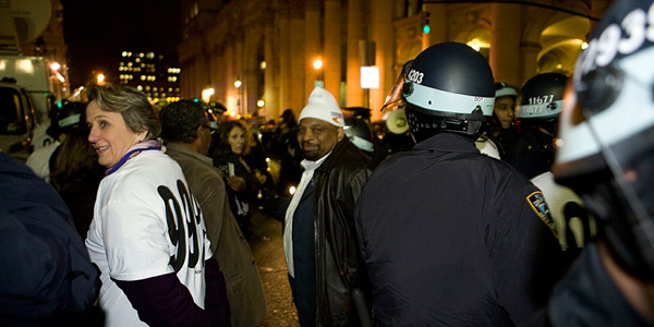 By late afternoon, the Foley Square rally began to swell. And as darkness fell, tens of thousands had crowded into the area. Among them were unionists, students, children, seniors and clergy. “I decided that I’m not going to stay home and watch things happen,” said Helena Clark, a St. John’s Episcopal Hospital RN. “I’m a single mom with two kids in college. I’m part of that middle class, the 99 percent who can’t make ends meet.”