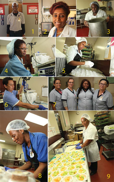 7. “We work in different parts of the hospital— wherever we’re needed when a patient is discharged. We go in and clean the rooms. There are about 12 housekeepers and we get the rooms done very efficiently,” says Germania Lopez, (third from left) an environmental services technician at UMH for four years.