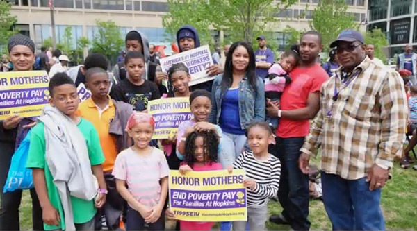 January 1, 1970Braving a brief storm that blew through Baltimore’s Inner Harbor, more than 3,500 1199SEIU members and supporters rallied on May 10 to end poverty pay at Johns Hopkins Hospital, which is touted as the number one hospital in the United States. The Mother’s March and Rally for Justice was energized by busloads of 1199 members from New York, New Jersey and Massachusetts and was a strong show of support for 2,000 members at Hopkins, who have been in contract talks for more than two months. In the negotiations, the union’s main message is that Hopkins pay is so low that many workers must rely on food stamps or Medicaid to get by.The latest union proposal will lift pay immediately to $15 an hour for all those with at least 15 years of experience, and guarantee those with less seniority at least $14 an hour by the end of a four-year contract. Right now, 70 percent of Hopkins caregivers make less than the $14.92 hourly wage that qualifies a single parent and child for food stamps."This is a fight for workers not only here in Baltimore, in Maryland, in the region, but workers in this country—and workers around the world," said actor and activist Danny Glover from the stage, as he faced a sea of people covered in yellow rain ponchos.Evoking the names of other well-known artists and activists who have stood up for working people, Glover reminded the crowd that 45 years ago Coretta Scott King came to Baltimore to help Hopkins workers establish their union.“We’re going to march on Hopkins, block by block, from city neighborhood to city neighborhood,” said Wendell Pierce, best known for his roles on “The Wire,” a television series based in Baltimore, and “Treme.” “And we’ll shut it down unless we get the wages that we deserve.”Several Hopkins workers spoke, some of them featured in local and national advertising on radio and online publications, including The New York Times, Crains, The Baltimore Sun and the campaign website, HardshipAtHopkins.org. When TV cameras showed up to cover the rally, these same members were ready to tell their story."I'm in a homeless shelter and I can't leave because I don't have enough money to move out," Simone Hicks, a floor technician at Hopkins, told a local ABC affiliate. The noon rally at McKeldin Square also featured Hopkins doctors and students, clergy and nurses, who melded the issues of economic justice and public health, which is a Hopkins mandate included in its mission. A local band, GQ, played old school rhythm and blues throughout. Then the massive crowd marched a few blocks to Westshore Park, where there was a Family Fun Day Event with free food and activities for children, such as face painting and hula hoops. Franklin Stephen, a carpenter at Jamaica Hospital in Queens, NY for 19 years, got up extra early to ready nine children, his wife and two grandchildren for the trip to Baltimore. “I felt strongly that we had to be here—I believe in supporting families,” said Stephen, a union delegate. “I believe we all need good wages and benefits. I heard this story and I said that we had to go down there to support these families in Baltimore. I make $26 an hour and that’s hard to get by on, so when I heard about people making $10 an hour I know that just won’t cut it these days. “As 1199ers, we have to go anywhere and do anything and say ‘NO!’ he added. “We have to fight this kind of outrage. It’s a slap in the face to working people.” Media Coverage Hopkins Workers Rallying For Better Pay Bring Star Power To Baltimore, WJZ-CBS Baltimore Hopkins workers rally for higher pay, WMAE-ABC2 Baltimore Johns Hopkins union workers rally for higher pay, WBAL-TV NBC Baltimore Thousands gather to protest pay at Hopkins Hospital, The Baltimore Sun Johns Hopkins workers rally for higher pay in MD, The Washington Post Johns Hopkins workers rally, want higher pay, WJLA-TV ABC Washington, D.C. Hollywood joins hospital workers to press Johns Hopkins to “pay a living wage", Baltimore Brew Cory Syms - John Hopkins (Wage Rally)- See more at: http://www.1199seiu.org/thousands_of_1199ers_tell_johns_hopkins_end_poverty_p
