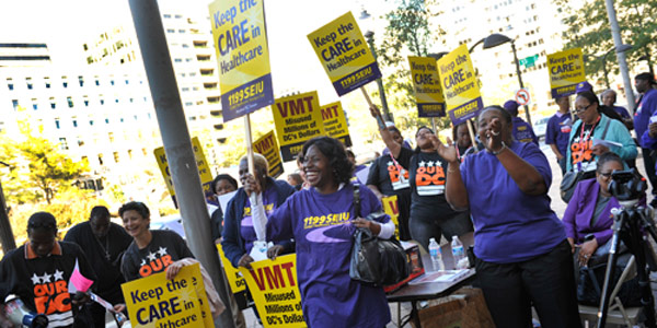 There was excitement inside and outside D.C. City Hall on Monday as nursing home contractor Solanges Vivens was brought before a special hearing to testify about the serious problems with finances and care at facilities she runs for the District.While council members grilled Vivens up on City Hall’s fourth floor, caregivers at the Vivens-run J.B. Johnson nursing home rallied on the building’s steps with a broad coalition of labor and community supporters. The J.B. Johnson workers voted 165-0 to unite in 1199SEIU in February 2010, but have been denied a fair contract by Vivens ever since.“This isn’t just a fight for a contract at one nursing home,” said Jos Williams, President of the Metro Washington Labor Council. “This is a fight for working people everywhere, and when we work together no one can stop us.” Williams was flanked as he spoke by representatives from the Teamsters, SEIU 32BJ, IBEW, AFSCME, AFT, the Ironworkers, UNITE HERE, and OUR DC, the community-labor grassroots group.The special hearing was called by the District Committee on Aging and Community Affairs soon after the D.C. Inspector General released an explosive report about VMT in September. The report found that Solanges Vivens’ company, VMT, was responsible for losing the District $2.7 million and urged the city to recoup the funds.The report also found that VMT wrongly spent $181,000 of D.C. funds on attorneys to combat the organizing efforts of workers at J.B. Johnson and another D.C.-owned nursing home.“We just want a fair contract,” said Melvina Jacobs, a CNA at J.B. Johnson. “All we want is the ability to provide for ourselves and our families so that we can focus on what’s most important to us: taking care of our residents.”“Too many of us have worked at J.B. Johnson for years without receiving a raise and too many of us have substandard health benefits for ourselves and our families,” said LaQuita Coates, a CNA at J.B. Johnson. “But while we struggle, Solanges Vivens is misusing millions of dollars in D.C. taxpayer money and she paid herself almost $2 million in one year alone. That’s not right, and we won’t take it anymore.”It was in 2008 that VMT paid CEO Solanges Vivens $1.8 million. That year, VMT’s total revenues were just $8.1 million. And from 2004 to 2008, the small company paid Vivens, who is VMT’s sole shareholder, a total of $3.5 million.And while Vivens has enriched herself at the expense of D.C. taxpayers, she has also offended D.C.’s African-American community. Early this year, as J.B. Johnson workers ramped up their campaign for improvements at the home, Vivens suddenly changed the name of the facility to “Unique Residential Care Center.” The name change was deeply disrespectful to the memory of Dr. J.B. Johnson, a pioneering black cardiologist and a public health champion.Mrs. Audrey Johnson, the widow of Dr. Johnson, testified at Monday’s hearing and expressed deep disappointment with Vivens’ betrayal of her husband’s legacy. Mrs. Johnson and 1199 are now working together to restore the name of Dr. Johnson and ensure that his legacy of public service is honored.- See more at: http://www.1199seiu.org/washingtonians_rally_against_a_dc_rogue_contractor_mddcreg#sthash.j3pGYuFr.dpuf