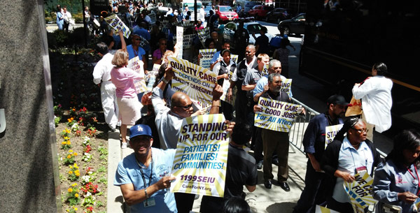 New York City- On Wednesday, June 18, thousands of nurses and caregivers held protests for quality care and good jobs at 100 facilities throughout the New York City area. The “informational picket lines” at hospitals, nursing homes, clinics and other facilities mark the launch of an effort to educate patients and the public about healthcare CEOs who are severely threatening the quality of healthcare services and jobs for New Yorkers.